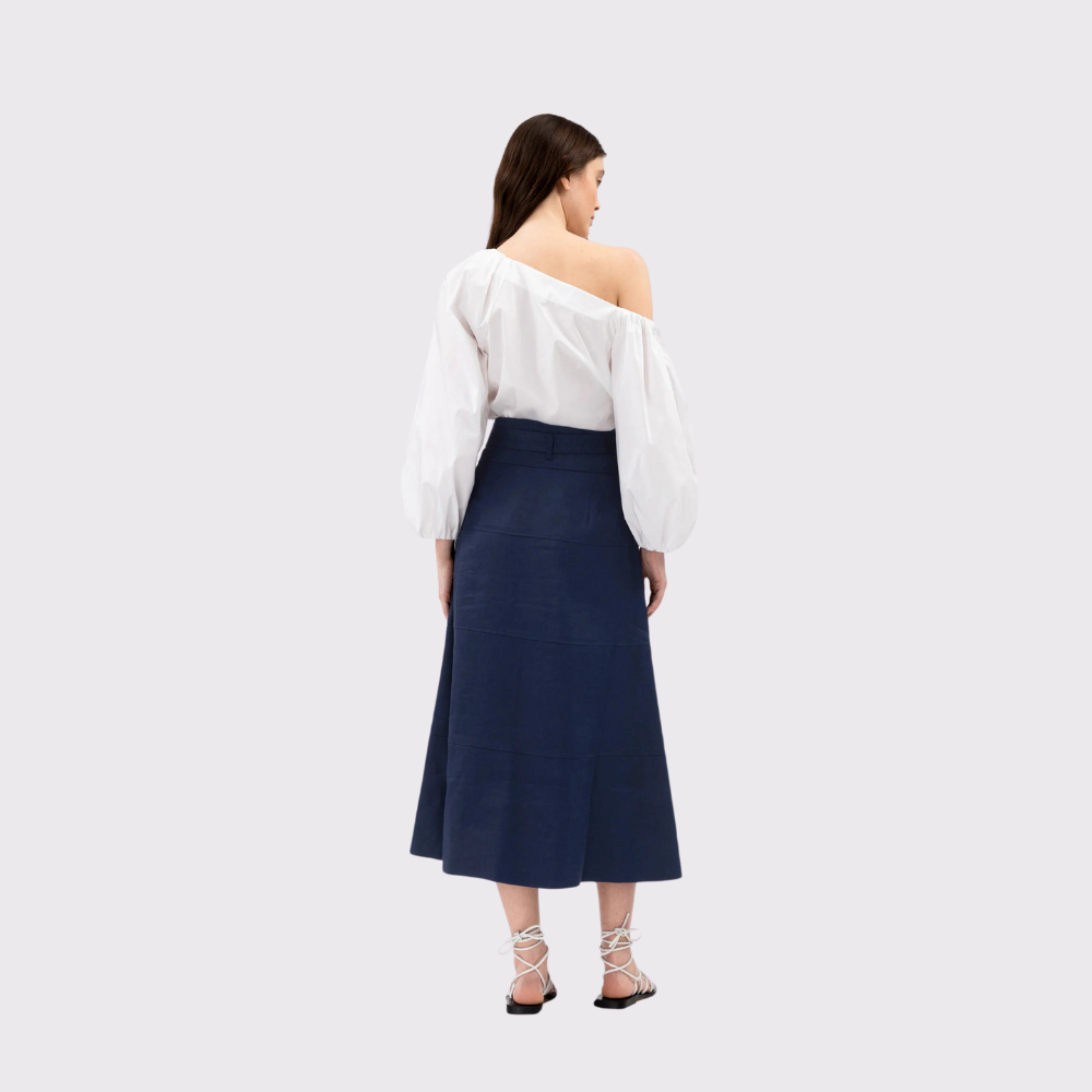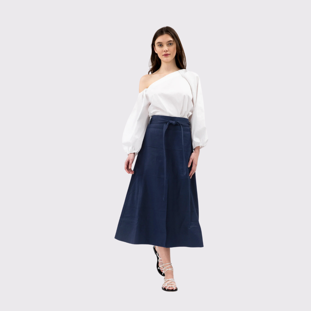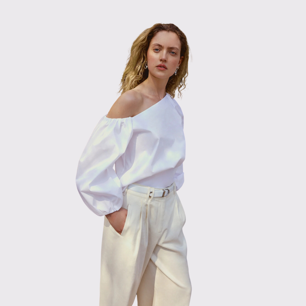 Introducing the Tanya Taylor Tabitha Top, crafted in luxurious cotton poplin. With an asymmetrical off-the-shoulder neckline, voluminous lantern sleeves, and delicate shoulder pleating, this top is the perfect blend of femininity and edge for day-to-night allure this Spring.