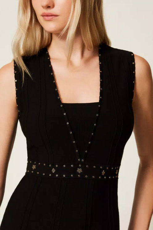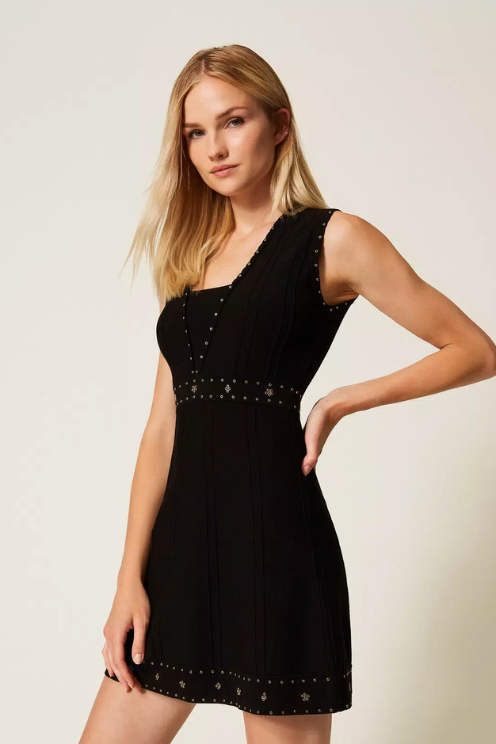 Get ready to sparkle in the Short Knitted Dress with Rhinestones, crafted from stretchy viscose knit for a perfect fit. Featuring eye-catching rhinestone rivet accents, a wide neckline, and shoulder straps, this flared dress highlights your silhouette with its waist seams. The unique Oval T logo plate on the back adds a fun, stylish touch to this playful must-have for your wardrobe.
