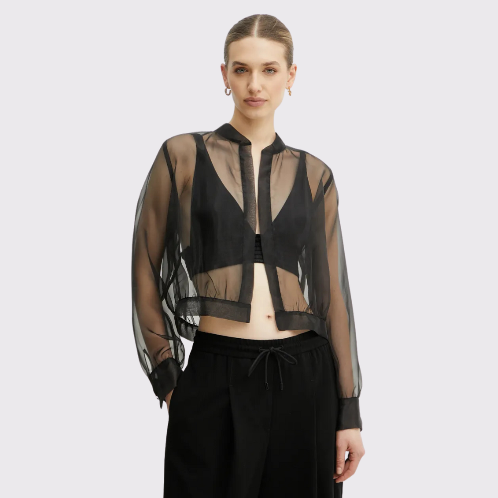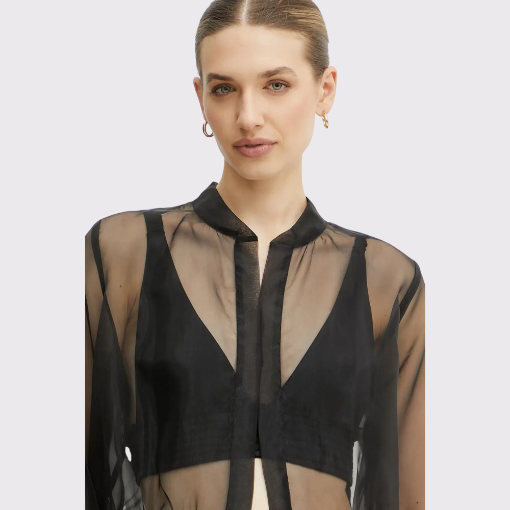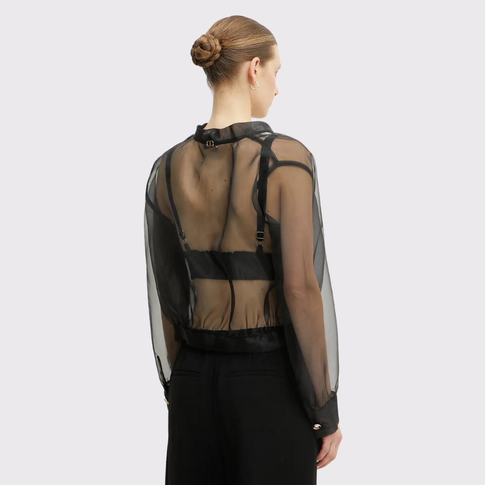 Elevate your wardrobe with this effortlessly chic cropped blouse from Twinset Milano. Crafted from sheer black organza, this piece features a relaxed silhouette with a stand collar, long voluminous sleeves, and wide buttoned cuffs for a polished finish. The open front design and cropped length add a modern edge, while the delicate transparency creates a striking layered look when paired with a bralette or camisole underneath. Finished with a subtle gold-tone logo detail at the back neck.