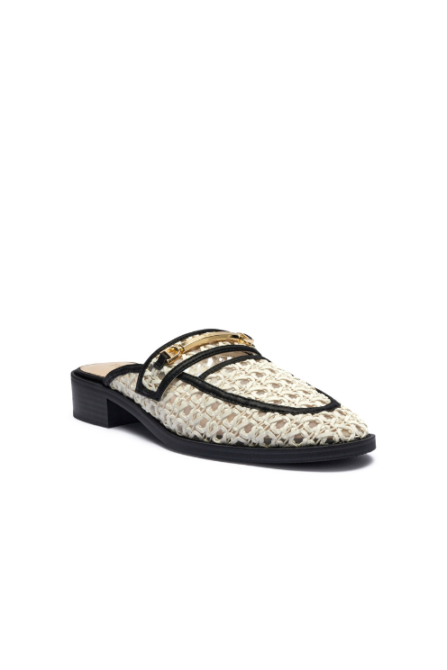 Step into effortless elegance with these woven mules from Twinset Milano. Crafted with an airy raffia-style weave in a refined ivory tone, they feature sleek black leather trim and a polished gold-tone bar for a sophisticated touch. The slip-on design is complemented by a low stacked heel and cushioned insole, offering both comfort and elevated style. Perfect for warm-weather days or dressing up a casual outfit with European flair.