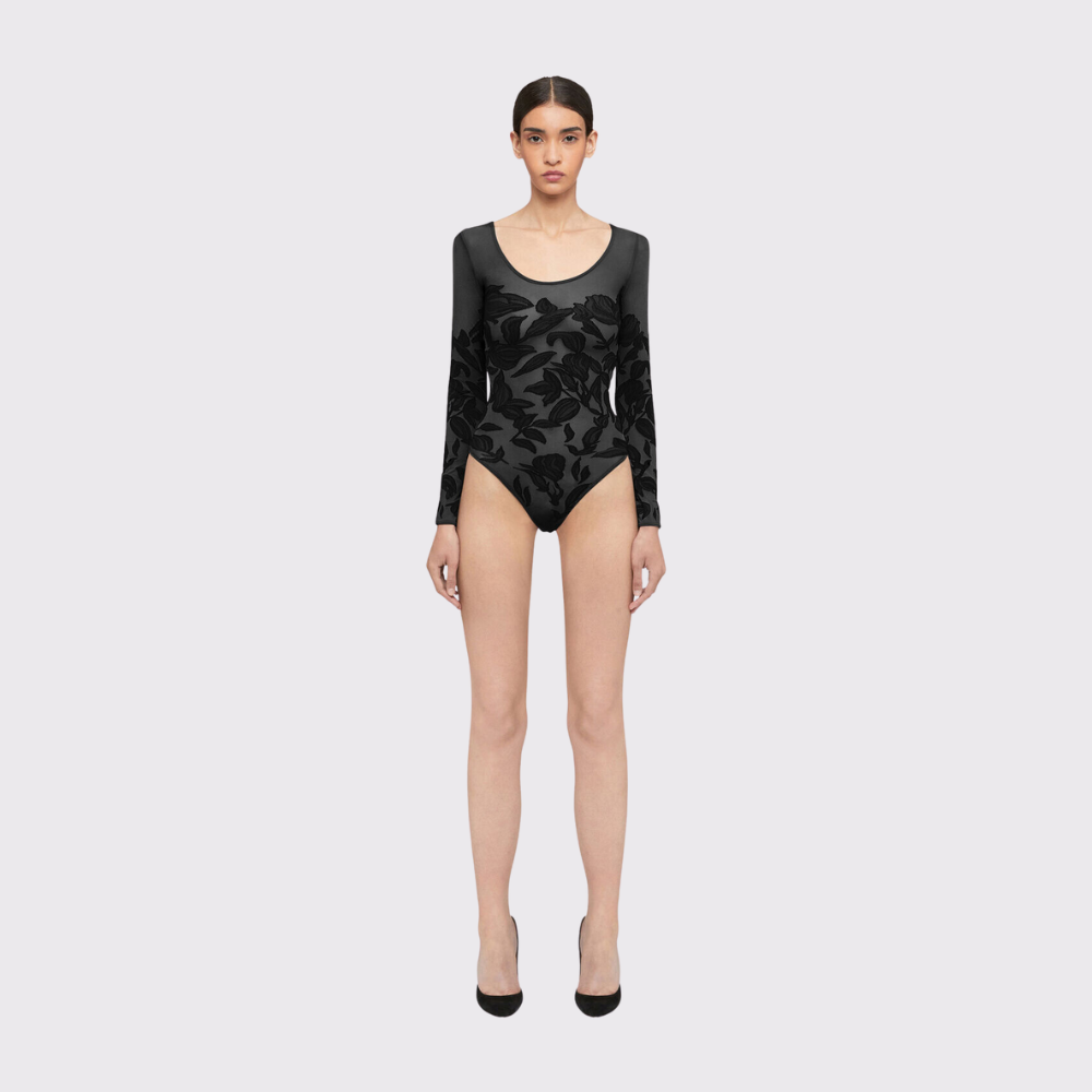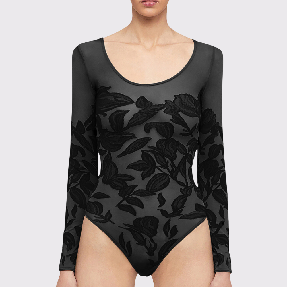 Experience the romance of Wolford's Bodysuit 78312/F23! The high-contrast matte floral lace combines with a slim fit style and seamless design to create an irresistibly beautiful look that's as elegant as it is comfortable. The snap closure and cotton gusset make it easy to wear and the knitted hemlines of the long sleeves add a touch of sophistication. Show off your beauty and grace with this timeless bodysuit.